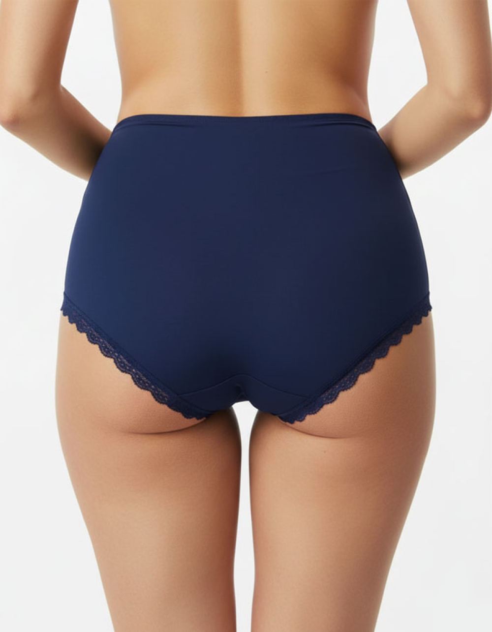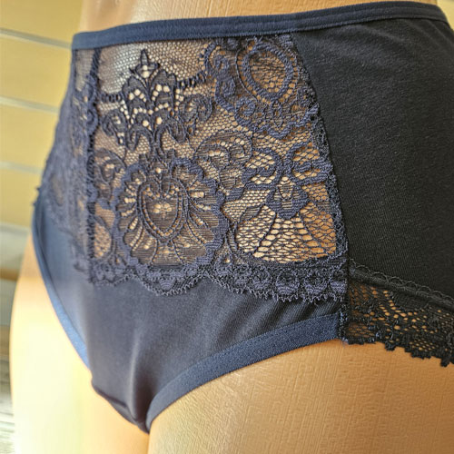 Бикината е с висока талия и дантелени притурки на задна част, за да не се отбелязва отзад.