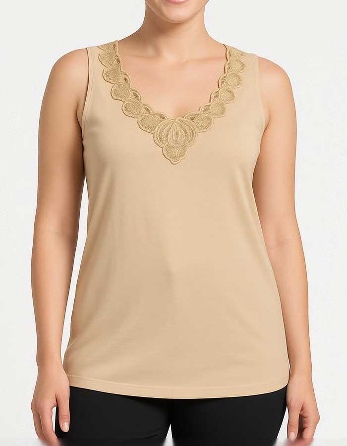 Удобен и практичен корсаж  с широка презрамка от висококачествено памучно трико и красива бродирана апликация.