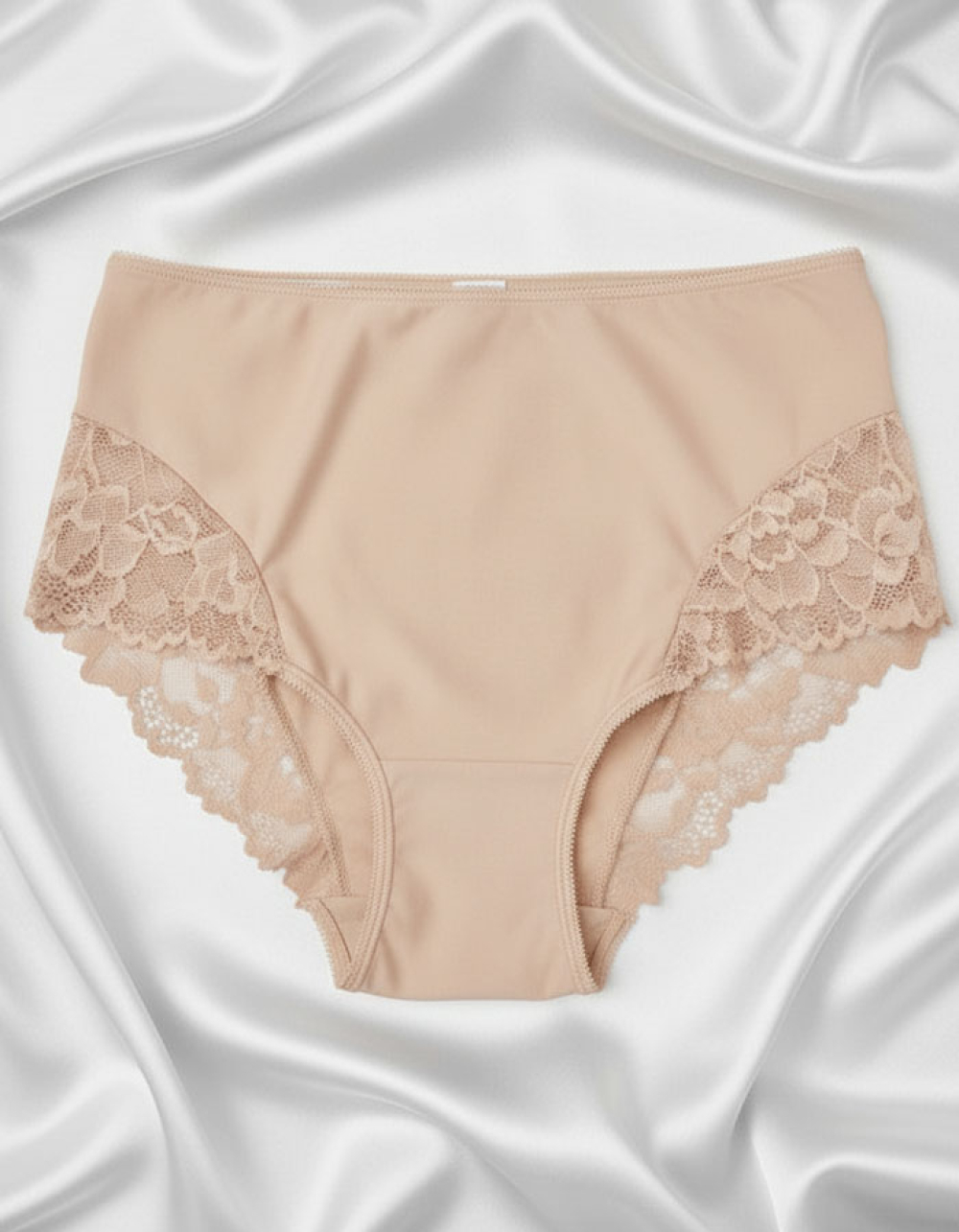 Луксозна бикина с висока талия от микрофибър и дантела, бежов, 274