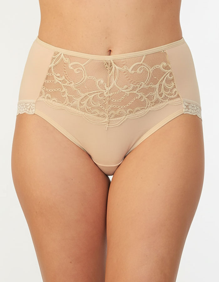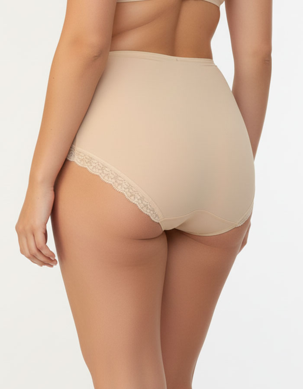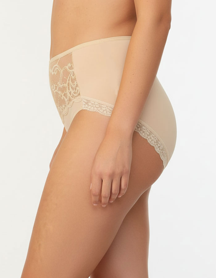 Бикината е с висока талия и дантелени притурки на задна част, за да не се отбелязва отзад.