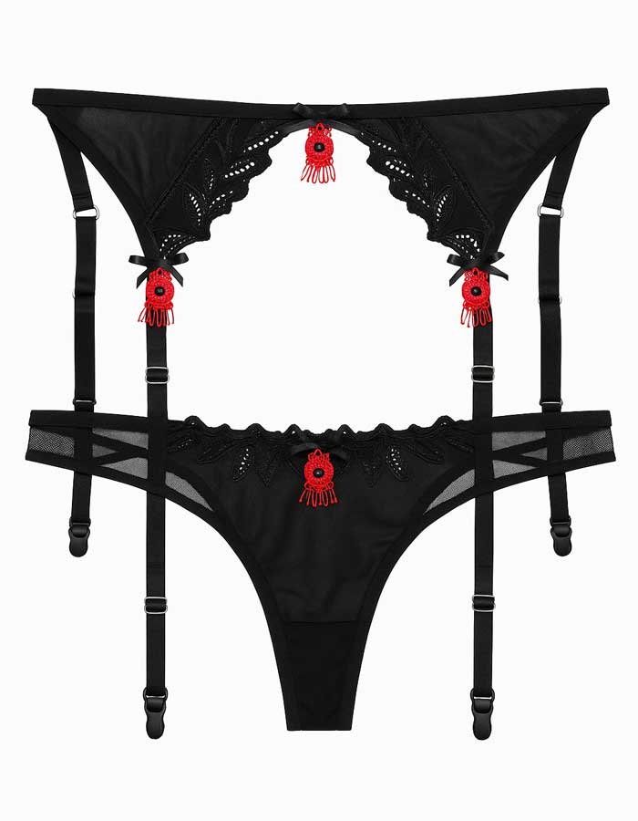 Секси жартиер колан със закопчаване отзад от дантела , тюл и червени акценти.
