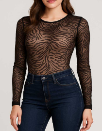 Боди блуза от тюл, БИКИНА, черен с кафяв, 055